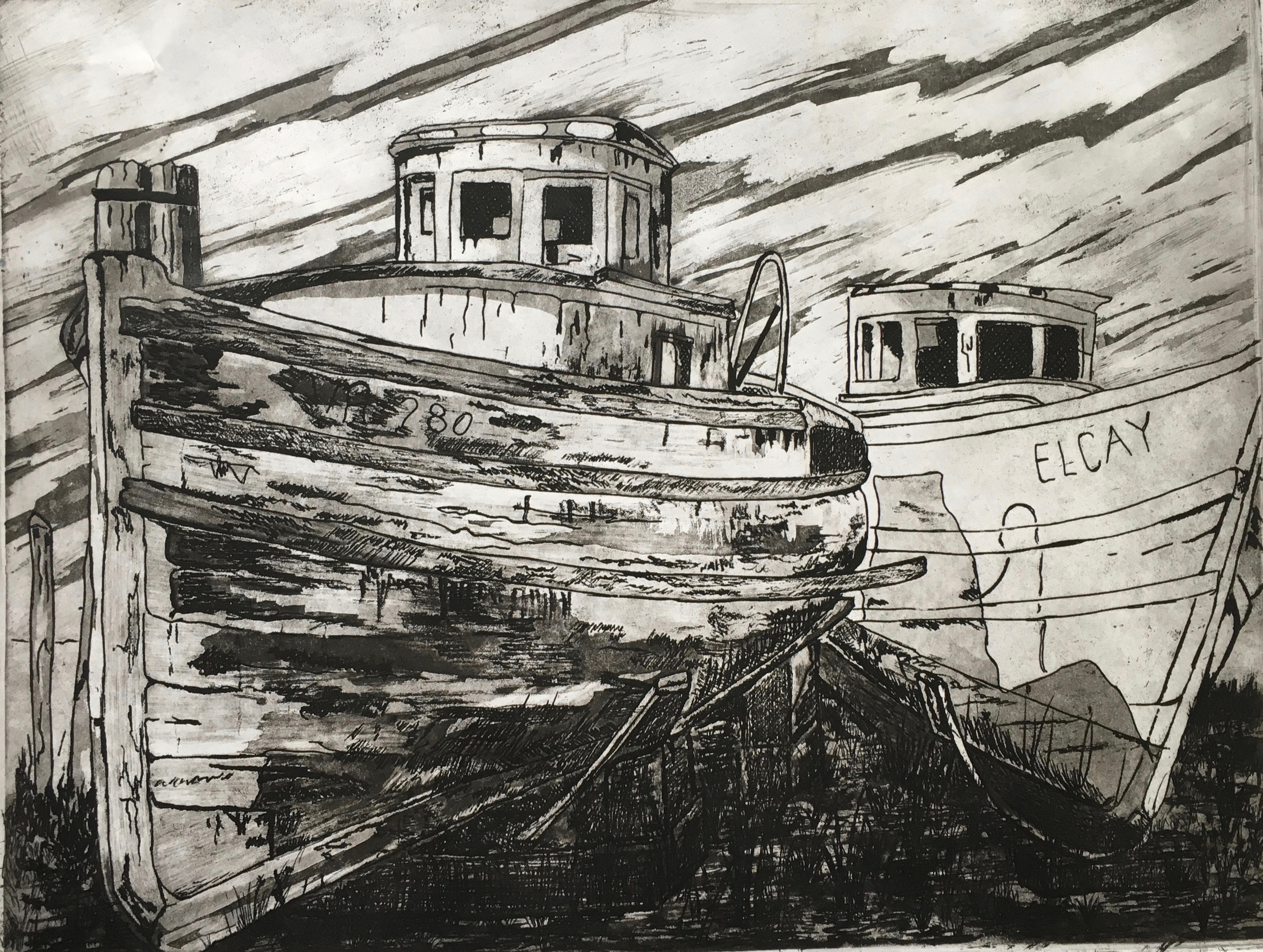 That drawing and a course I took in printmaking at North Island College with John Hooley changed my direction to some extent. I was still interested in painting and drawing, but now I would add printmaking to my repertoire, a medium I very much enjoy. This drawing became the first intaglio print I did. I used a zinc plate that was etched in nitric acid to get the effect I wanted, which was this: